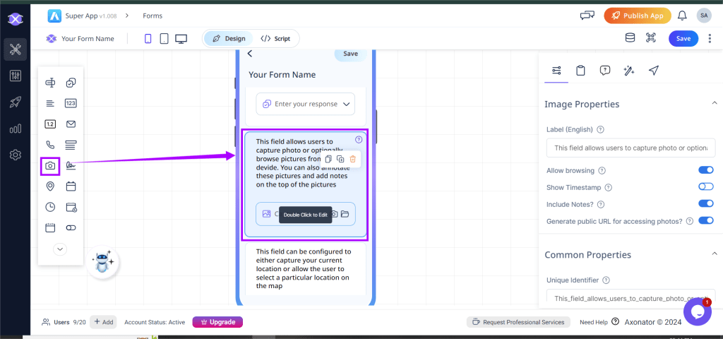• The photo field allows users to capture pictures directly within the form on mobile devices