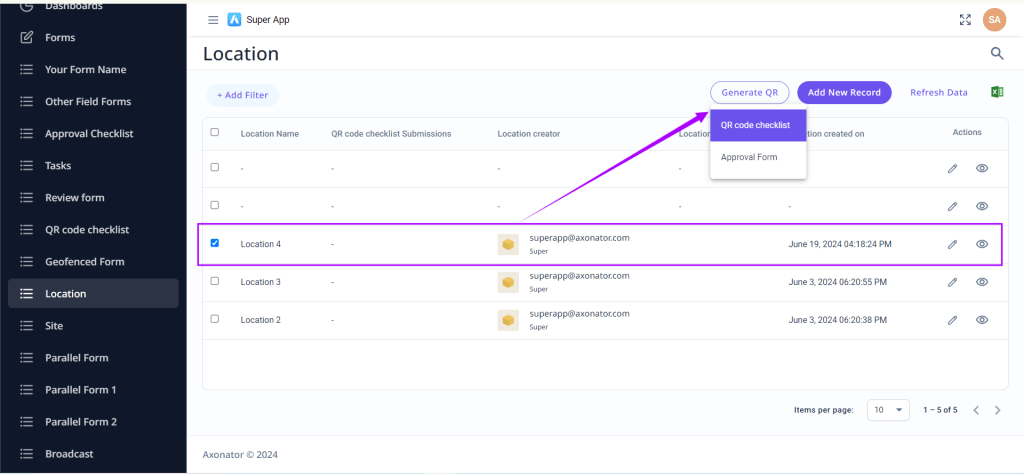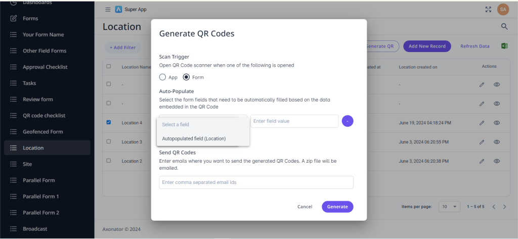 • Choose the app and form for which you want to create the QR code