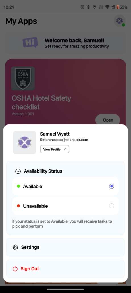 But wait, there’s more! See that Axonator logo at the top right? Tap on that, and you can set your availability status, access settings, and even sign out.